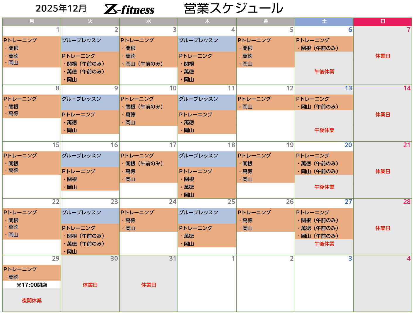 | 2025.04.23 | 2025年5月のスケジュールを掲載しました。5月より岡山トレーナーが正式に加入いたします |