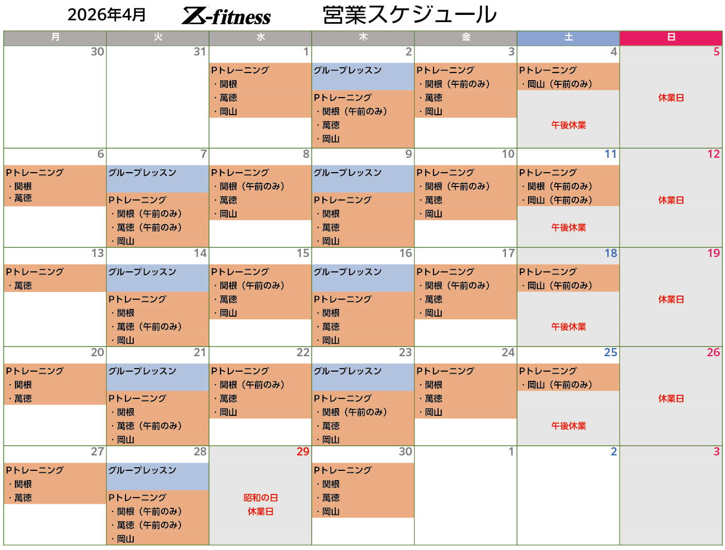 | 2025.03.31 | 2025年4月のスケジュールを掲載しました。4月より萬徳トレーナーが正式に加入いたします |